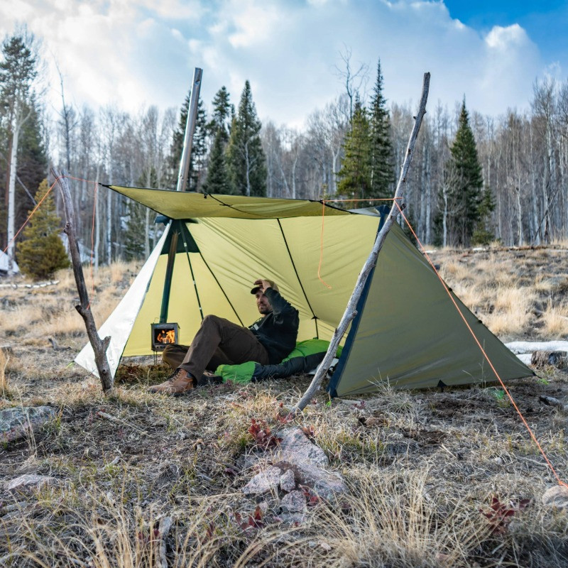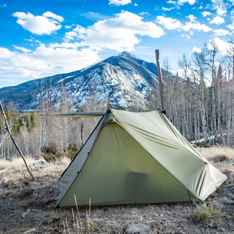 The Guardian is an ultralight two person hot tent that is lightweight enough for solo use.